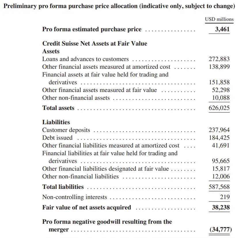 Die UBS geht gemäss FORM F-4 Filing an die SEC vom 9. Juni 2023 von einer «fair value of net assets aquired» von USD 38.24 Milliarden aus, bei einem Kaufpreis (purchase price) von USD 3.41 Milliarden: